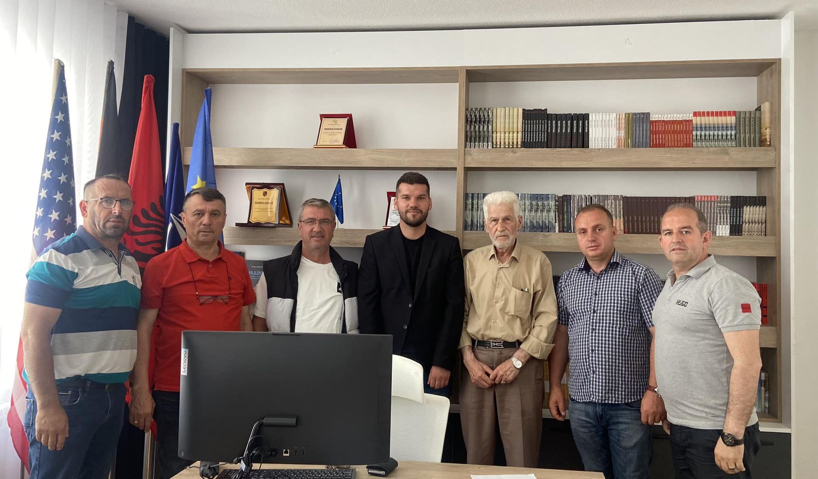 Bujanovac, 9. jun 2023. Novi predsednik Nacionalnog saveta Albanaca (NSA) Nevzad Lutfiu sastao se u sedištu saveta u Bujanovcu sa predsednicima organizacija ratnih veterana Oslobodilačke vojske Preševa, Medveđe i Bujanovca (OVPMB).