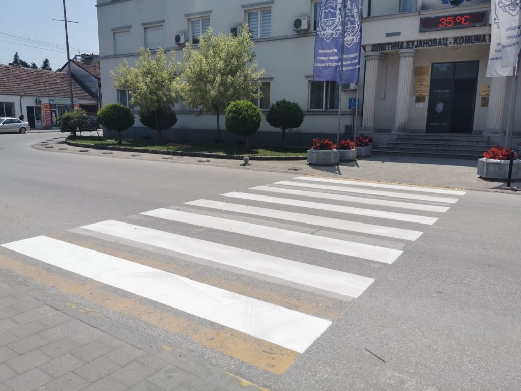 Bujanovac, 11. jul 2023. U Bujanovcu je danas počelo obeležavanje pešačkih prelaza u centru grada. Dvokomponentne boje kojim se radi horizontalna signalizacija koriste se prvi put i imaju garanciju do 3 godine – kaže za Bujanovačke inženjer saobraćaja Dursan Selimi iz opštinskog Odeljenja za investicije i razvoj.