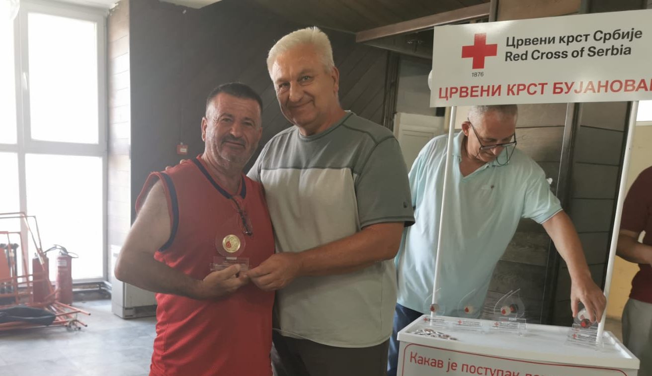 Bujanovac, 27. jul 2023. Bujanovčanin Donča Cvetković dobrovoljno je dao krv čak 100 puta i za svoju humanost je dobio priznanje od Crvenog krsta Bujanovac. Nikola Nakić iz Klinovca i Sedat Pejda iz Bujanovca takođe su nagrađeni priznanjem za 75 dobrovoljnih davanja krvi.