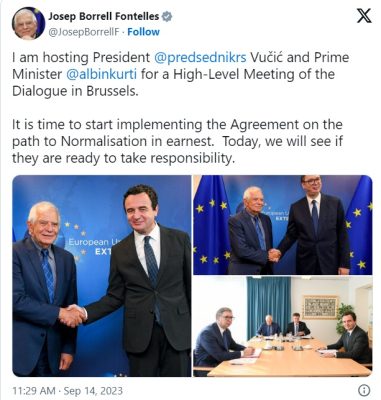 “Domaćin sam predsedniku Vučiću i premijeru Kurtiju na Visokom sastanku dijaloga u Briselu. Vreme je da ozbiljno počnemo sa sprovođenjem Sporazuma o normalizaciji. Danas ćemo videti da li su spremni da preuzmu odgovornost”, napisao je Borelj.