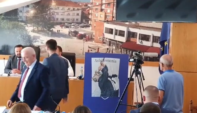 Dok se Arifi obraćao Skupštini, ova dvojica su na govornicu zalepili veliki poster na kome sa natpisom “Asfaltomanija” i slikom čoveka koji jede asfalt.