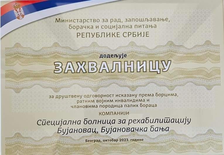 Bujanovac, 6. oktobar 2023. Specijalna bolnica za rehabilitaciju u Bujanovačkoj Banji dobila je zahvalnicu za društvenu odgovornost iskazanu prema borcima, ratnim vojnim invalidima i članovima porodica palih boraca, jer je omogućila popuste za sve one koji imaju boračku karticu.