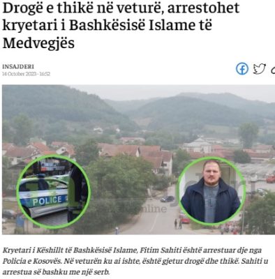 Bujanovac, Medveđa, 16. oktobar 2023. – Predsednik Saveta Islamske zajednice u Medveđi Fitim Sahiti i jedan Srbin iz tog mesta uhapšeni su na Kosovu pošto je policija u automobilu u kome su se nalazili pronašla supstancu za koju se sumnja da je marihuana, kao i hladno oružje, piše prištinski Insajderi. Oni su uhapšeni na putu Priština – Gnjilane u petak.