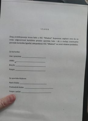 Bujanovac, 12. februar 2024. – Zbog stanja u kome se nalazi sportska hala Mladost u Bujanovcu sportski radnici, treneri i igrači potpisuju izjavu da „zbog prokišnjavanja krova na svoju odgovornost koriste prostor sportske hale i da u slučaju povrede KSC Mladost ne snosi nikakve posledice“.