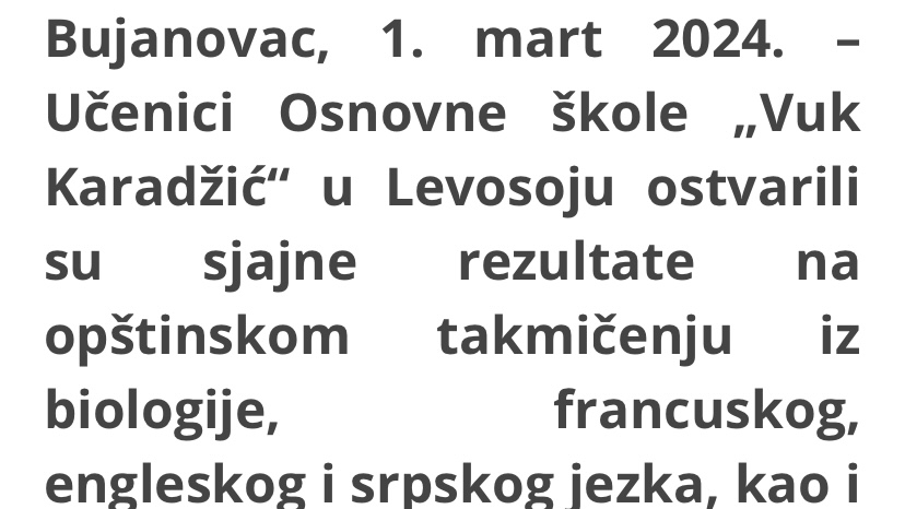 Bujanovac, 2. mart 2024. – Vest o tome da se određen broj učenika Osnovne škole „Vuk Karadžić“ u Levosoju plasirao na okružno takmičenje iz francuskog, engleskog i srpskog jezika, kao i iz matematike i fizike izazvao je na našoj Fejsbuk stranici oštru polemiku, sa dominantnim mišljenjem pojedinih sugrađana da Bujanovačke “favorizuju određene škole, da je tekst naručen i da iznosimo netačne informacije“.