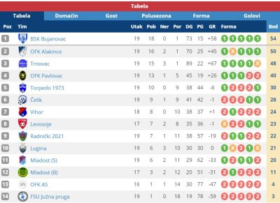Bujanovac, 29. april 2024. (Foto arhiva)- Fudbaleri bujanovačkog BSK suvereno vladaju Pčinjskom okružnom ligom i posle 19 odigranih kola. Bujanovčani su ovog vikenda sa 4:0 slavili protiv Radničkog 2021 iz Vranja i sada su prvi na tabeli sa 54 boda. Sledi OFK Alakince sa 50, dok je Ternoci treći sa 48 bodova.