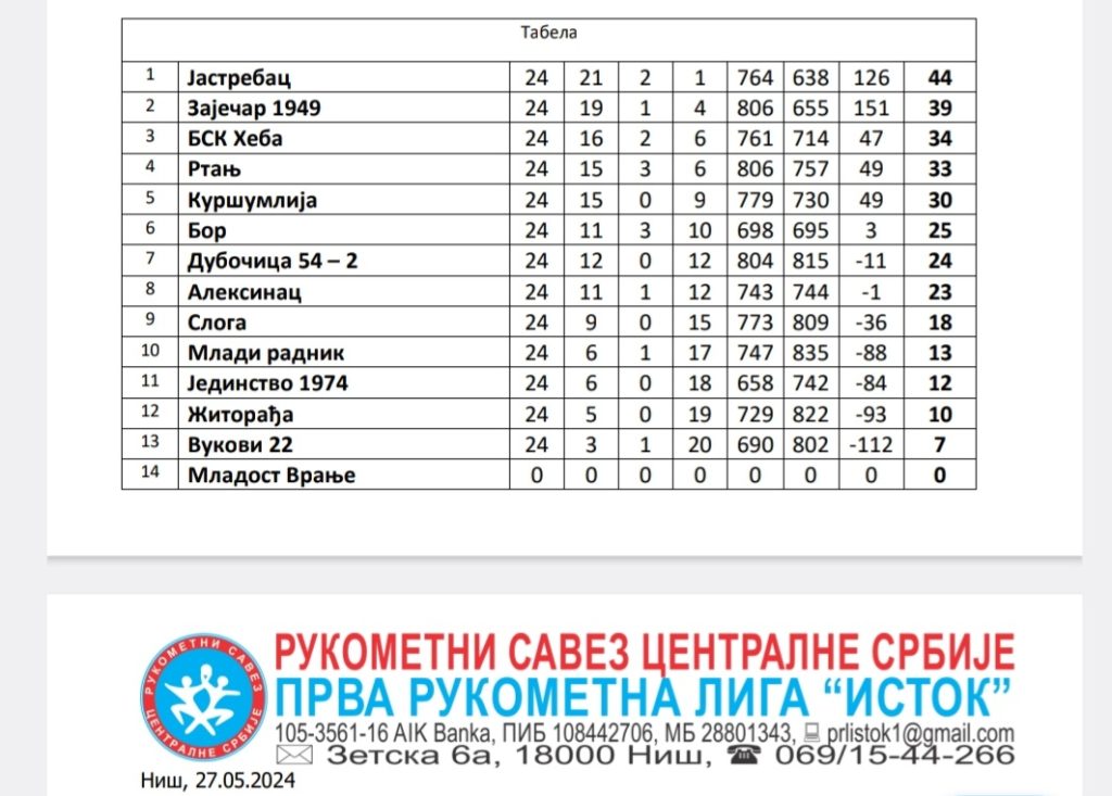 Bujanovac, 30. maj 2024. Rukometni klub BSK Heba iz Bujanovca sezonu u Prvoj ligi Istok završio je u vrhu tabele, odnosno na trećem mestu, što je uspeh dostojan reputacije kluba. Na kraju uspešne sezone predsednik kluba Zoran Milošević zahvalio se svima koji su doprineli ovakvom rezultatu i poručio: Idemo dalje, nema odustajanja.