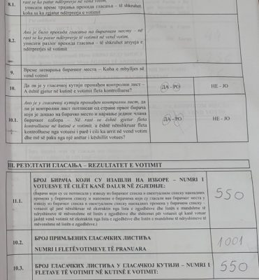 Na fotografiji ispod možete videti kopiju  zapisnika na kojoj se vidi da je označeno DA i na pitanje Da li je u glasačkoj kutiji pronađen kontrolni list, kao i na pitanje Da li je kontrolni list potpisan od strane prvog birača koji je došao na biračko mesto i najmanje jednog člana biračkog odbora.