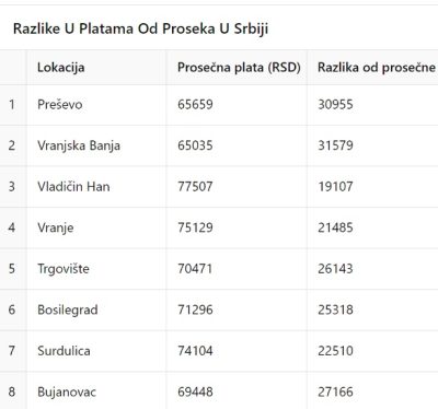 Od stanovnika Pčinjskog okruga sa prosekom od 73.497 dinara, manje plate imaju jedino meštani Jablaničkog okruga – 72.381 dinara.