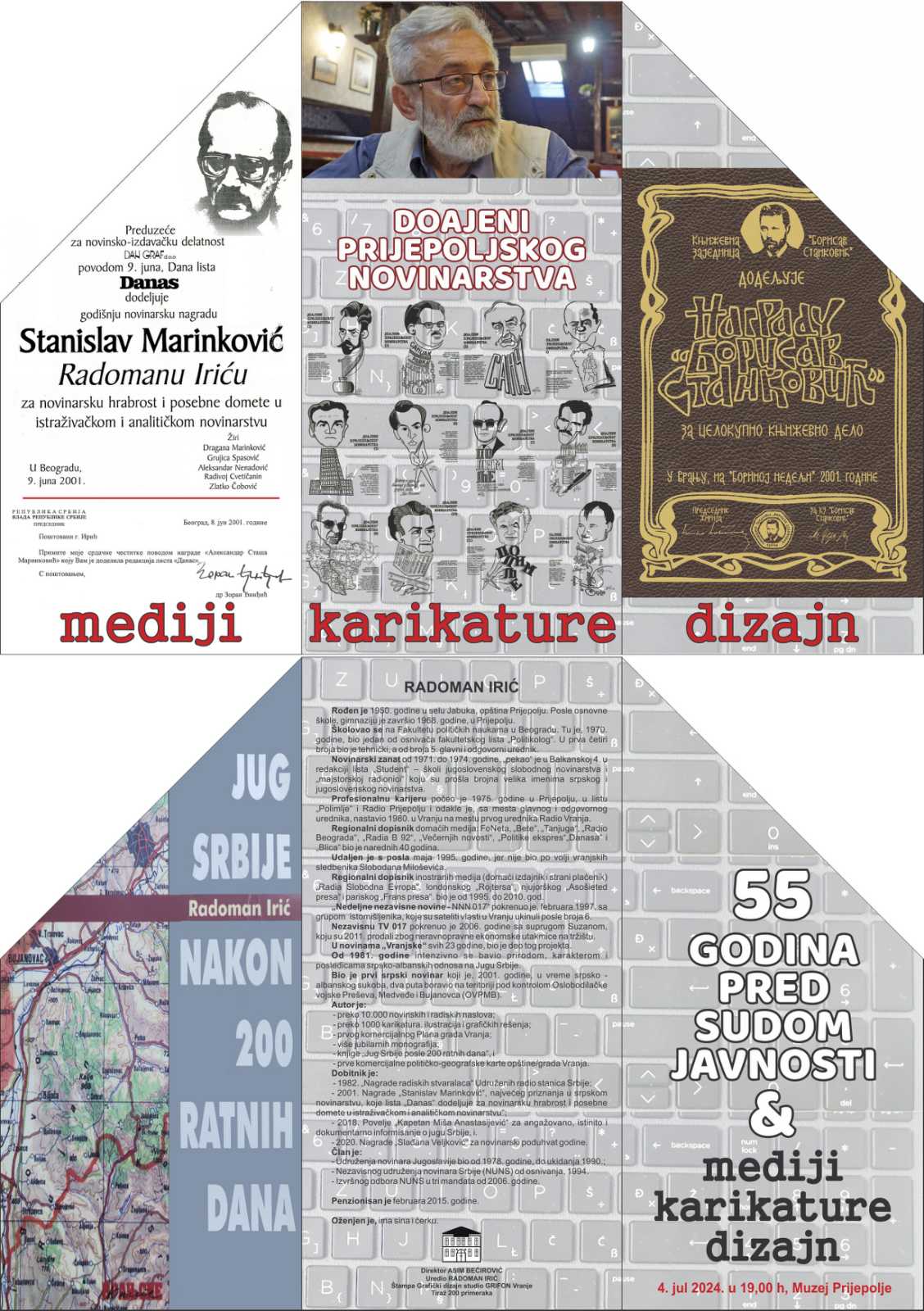 Bujanovac, Prijepolje, 20. jul 2024.- Povodom Dana oštine, Prijepolje – rodni grad novinara Radomana Irića, priredio je našem kolegi izložbu njegovog stvaralaštva pod nazivom „55 godina pred sudom javnosti – mediji, karikature, dizajn“.