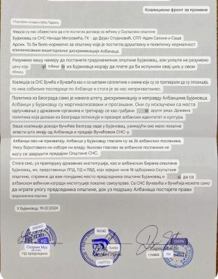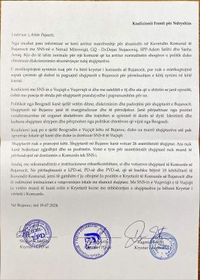 Bujanovac, 21. juli 2024. – Na adresu Arbera Pajazitija i Fronta za promene stigla je “nepristojna ponuda” od tri albanske stranke koje će po svemu sudeći uskoro u opoziciju.