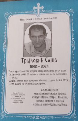 Bujanovac, 3. septembar 2024.- Saša Trajković, u gradu poznat i po nadimku Motka iz familije Karadničani, preminuo je rano ujutru u utorak 3. septembra sat vremena posle ponoći.