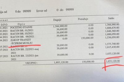 Ova suma, po zvaničnim podacima iz Doma kulture gde smo na uvid dobili i analitičke kartice kao dokaz, potražuje se od SUR Transit, čiji je Musliju bio vlasnik do gašenja firme, kao i od Pokreta za demokratski progres (PDP), čiji je aktuelni predsednik.