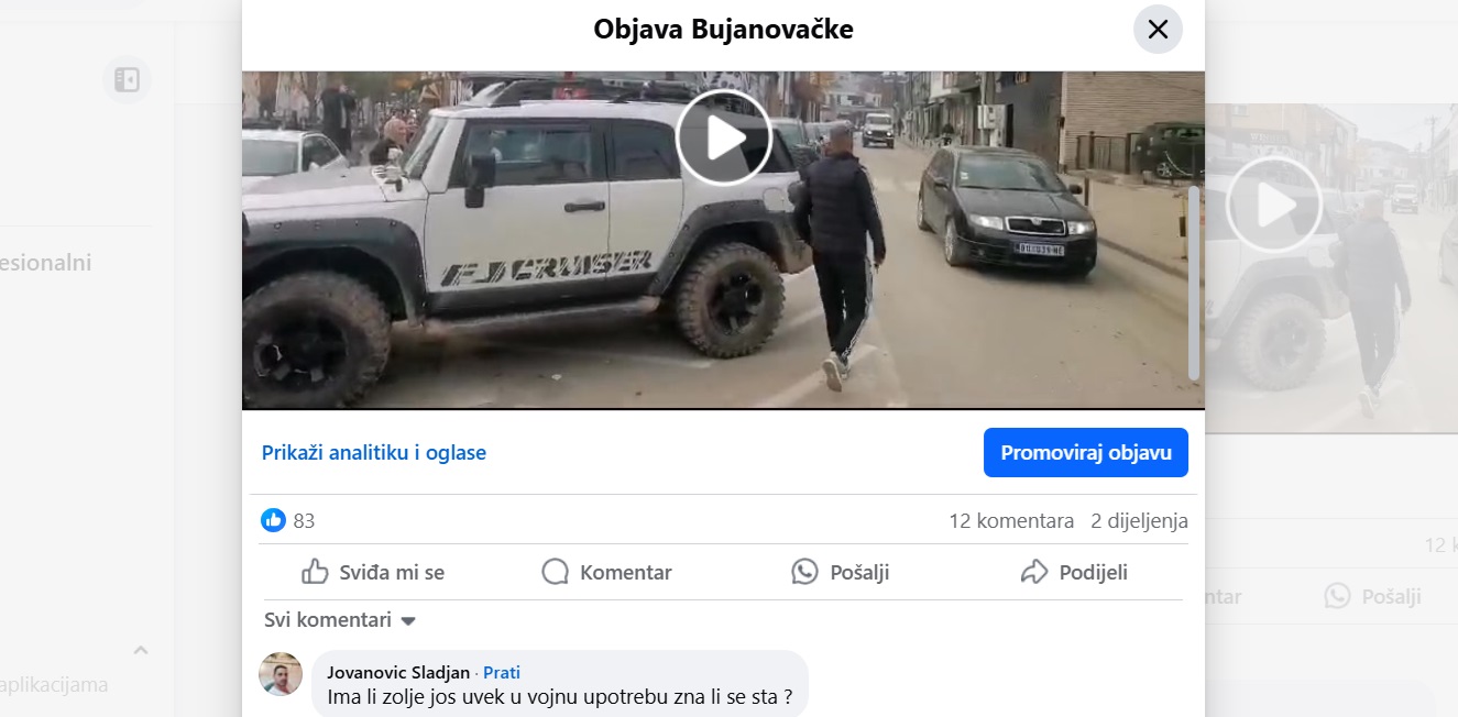 Bujanovac, 29. novembar 2024. – Ragmi Mustafi, funkcioner PDD, zatražio je reakciju nadležnih institucija povodom komentara na Fejsbuk stranici Bujanovačkih. Radi se o komentaru izvesnog Slađana Jovanovića na naš video snimak sa podizanja zastave Albanije na zgradi NSA. Po mišljenju Mustafija, komentar sadrži otvorenu pretnju upućenu Albancima pa očekuje reakciju nadležnih organa.