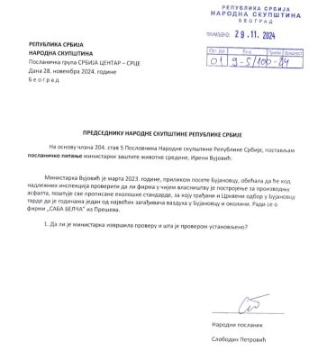Ovako glasi poslaničko pitanje opozicionog poslanika iz Vranja upućenog ministarki za zaštitu životne sredine.