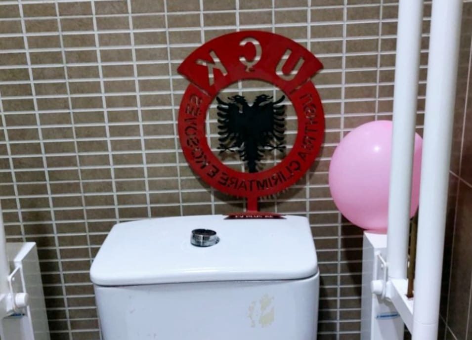 Bujanovac, Priština, 14. decembar 2024. (Foto FB)- Grb OVK (UÇK) na vodokotliću u toaletu javne institucije u Prištini, propisno je uzburkao tamošnju javnost. Na prvi pogled deluje da grb OVK služi kao dekoracija, ali mnogi ne tumače tako.