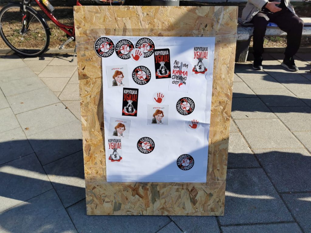 Pre petnaestominutne ćutnje, građani su simbolično lepili nalepnice sa natpisima “Korupcija ubija”, “Ako vam fali kičma, stavićemo svoju mi”, “Odgovornost” i natpis “uOBRAZI se!” iznad lika Zagorke Dolovac, vrhovne javne tužiteljke.
