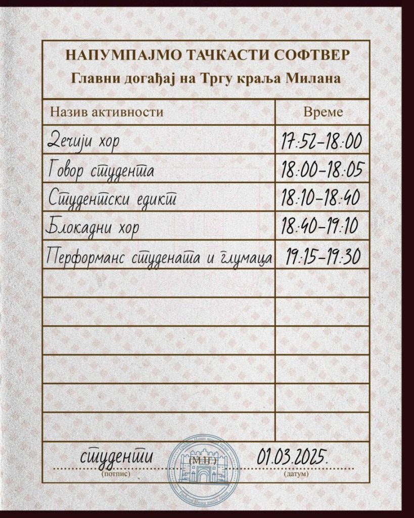Bujanovac, Niš, 25. februar 2025. – “Studentski edikt”, kako je nazvan veliki protest koji će u subotu, 1. marta biti održan u Nišu, počeće od 9 sati sa četiri lokacije i trajaće 18 sati, pišu Južne vesti. Glavni događaj biće na Trgu kralja Milana gde će nastupati horovi, bendovi, biće izvedena predstava „Ustav“, performans studenata i glumaca, a predviđeni su i govori studenata. Ka Nišu je peške krenulo i sedmoro studenata i građana iz Bujanovca.