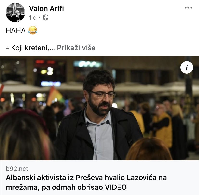 Bujanovac, 6. mart 2025.- Ni izdajnik ni plaćenik, samo Valon Arifi! Ovako je aktivista iz Preševa Valon Arifi reagovao na vest srpskih tabloida da je najpre hvalio Radomira Lazovića iz Zeleno-Levog fronta a potom obrisao svoj post: