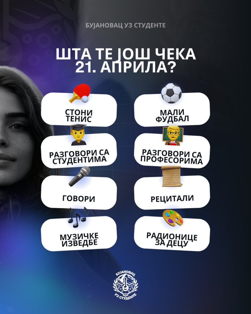 Bujanovac, 19. april 2025. – Ljubav, pravda, jedinstvo! Ovako bujanovački studenti pozivaju sve građane da im se pridruže na protestu koji organizuju u ponedeljak (21. april) na trgu u Bujanovcu. Početak protesta sa gostima iz brojnih gradova Srbije bujanovački studenti organizuju pod nazivom ”Kada grad ostane prazan – sa njim odlaze i snovi!” zakazan je za 11 sati.