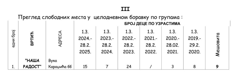 Pregled slobodnih mesta u celodnevnom boravku po grupama :