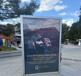 Bujanovac, 18. maj 2025. – Plakat sa likom Komandanta Lešija vraćen je na bilbord na trgu u Bujanovcu, pošto su ga nepoznate osobe oštetile prethodne noći.