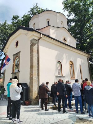 Bujanovac, 21. maj 2025. Meštani sela Srpska Kuća kod Bujanovca danas slave Svetog apostola Jovana Bogoslova i okupili su se u porti seoske crkve.