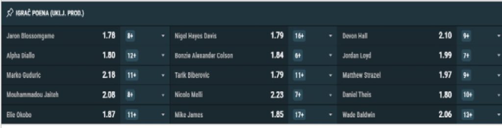 Za ljubitelje online klađenja, izdvojili bismo i opciju „poeni igrača“, koju možete pronaći na meridianbet.rs, a kvota da će Marko Gudurić biti igrač poena sa 11+ je 2.18.