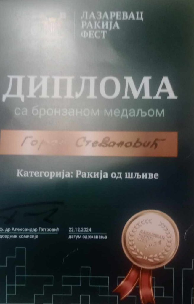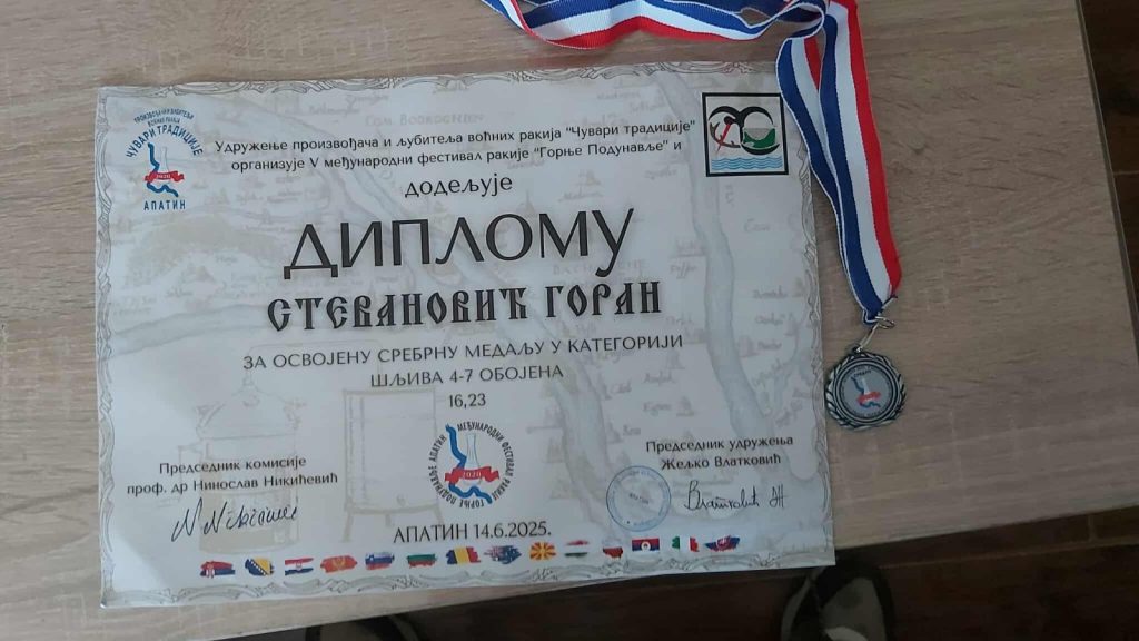 Bujanovac, 24. jun 2025. Goran Stevanović iz Žbevca kod Bujanovca osvojio je nekoliko nagrada za rakiju koju proizvodi. Najnoviju – srebrnu medalju u kategoriji „Šljiva 4–7 obojena“ osvojio je na 5. Međunarodnom festivalu rakije „Gornje Podunavlje“ u Apatinu.