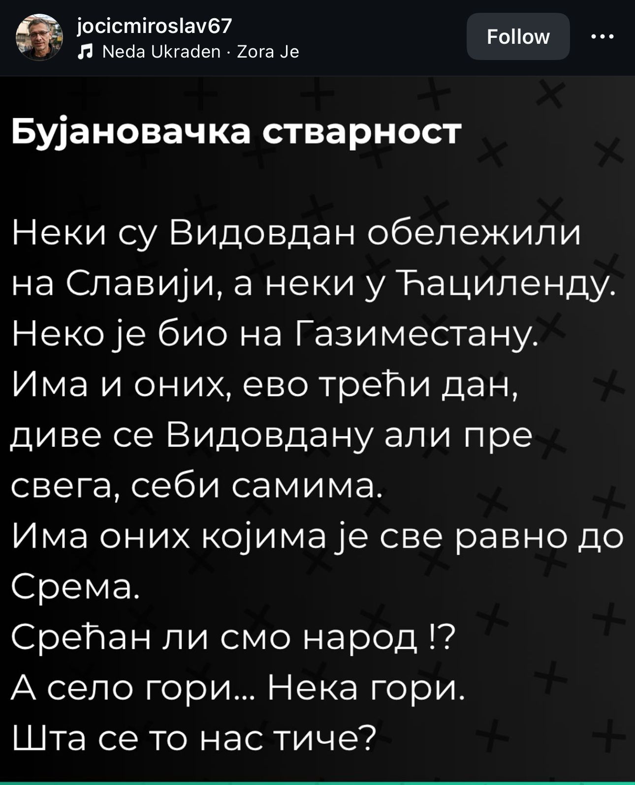 „Neki su Vidovdan obeležili na Slaviji, a neki u ‘Ćaćilendu’. Neko je bio na Gazimestanu. Ima i onih koji se treći dan dive Vidovdanu, ali pre svega – sebi samima“, poručio je profesor Jocić u objavi.