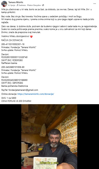 Tog dana Tamara je napisala: Danas sam obišla veterana Mileta, čekao me, nadao mi se. ‘Znaš, Tamara… čuo sam šta pišu… vređaju me. Ja mogu da podnesem glad i što mi kaplje, ali ovo… ovo me boli. Vređaju me moji ljudi. Oni za koje sam se borio
