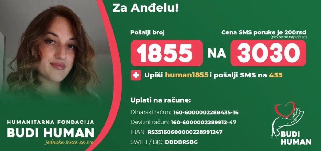 Humanitarna fondacija BUDI HUMAN prikuplja novčana sredstva za Anđelu Govedaricu (2000). Anđela je iz sela Donje Žapsko, udata je i živi u Vrbasu. Za njeno lečenje u Rusiji potrebno je 6,7 miliona dinara ili oko 60.000 evra. Ovaj novac treba da se sakupi do kraja septembra.