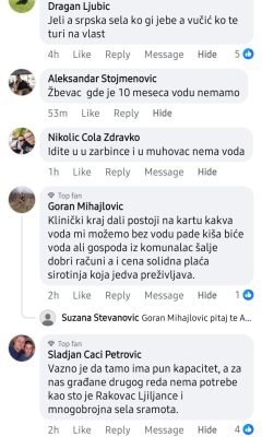 Goran Mihajlović piše: „Klenički kraj da li postoji na karti, kakva voda, mi možemo bez vode, pade kiša biće voda, ali gospoda iz Komunalca šalju dobre račune, a i cena solidna, plaća sirotinja koja jedva preživljava“, na šta je usledio odgovor „Pitajte Arsiće“.