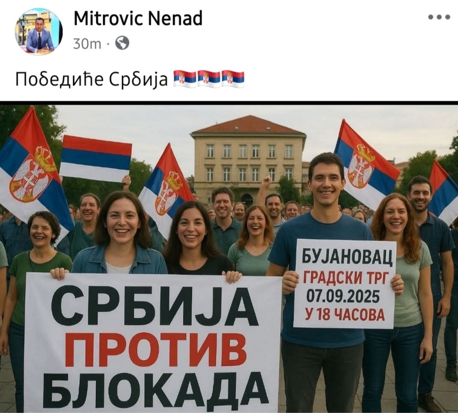 Bujanovac, 4. septembar 2025. Bujanovački naprednjaci ponovo će u nedelju (7. septembar) šetati gradom protiv nepostojećih blokada. Novo okupljanje Protiv blokada u čak 120 mesta u Srbiji prorežimski mediji najavljuju kao porodičnu šetnju. Dežurni nedavači Srbije protiv blokada koji hoće ljubav i da žive normalno dok se kreću na otvorenom i uče, u Bujanovcu će se okupiti u 18 časova.