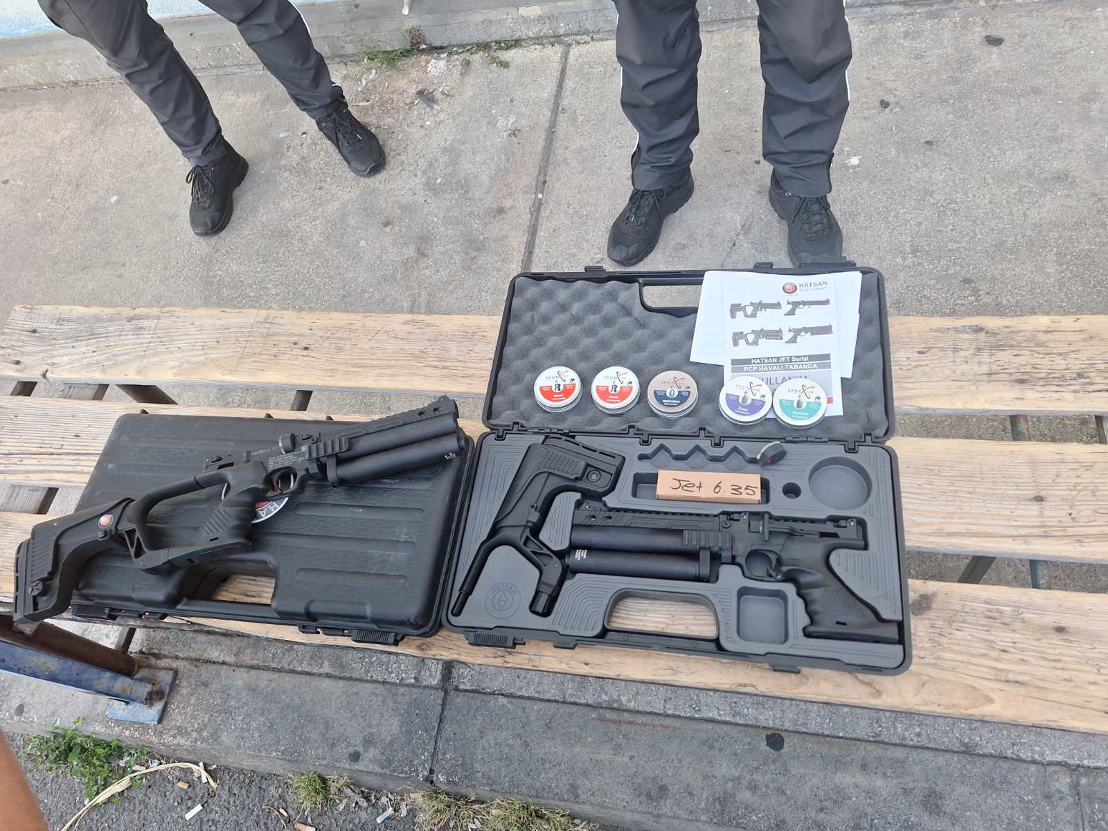 Tada su ispod prednjih sedišta pronađene dve kutije sa gasnim pištoljima ”Hatsan Jeet” kalibra 6,35mm, sa ukupno 10 kutija pripadajuće municije.