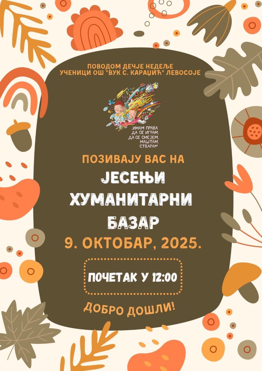 Bujanovac, 7. oktobar 2025. Povodom Dečje nedelje, učenici Osnovne škole „Vuk S. Karadžić“ iz Levosoja organizuju Jesenji humanitarni bazar, koji će se održati u četvrtak. 9. oktobra, sa početkom u 12 časova u prostorijama škole.