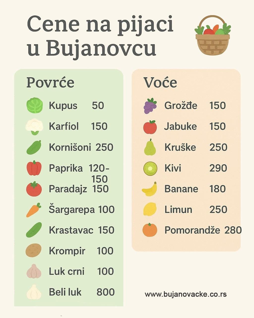 Najjeftiniji je kupus, koji se može naći već od 50 dinara po kilogramu, dok su karfiol i paradajz oko 150 dinara. Paprika se prodaje po ceni od 120 do 150 dinara, dok je beli luk i dalje najskuplji među povrćem – čak 800 dinara po kilogramu.