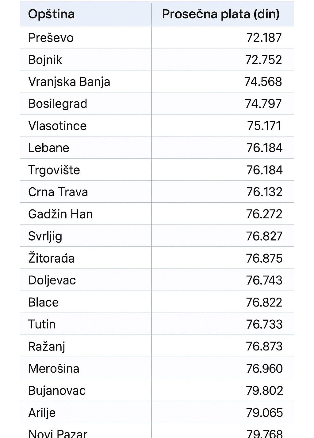 Prosečna plata u Srbiji je, za avgust 2025. godine, iznosila 105.590 dinara. Međutim, u čak 32 opštine u Srbiji plate su bile ispod 80.000 dinara, a najniže su zabeležene u Bojniku i Preševu – tek nešto više od 72.000 dinara.
