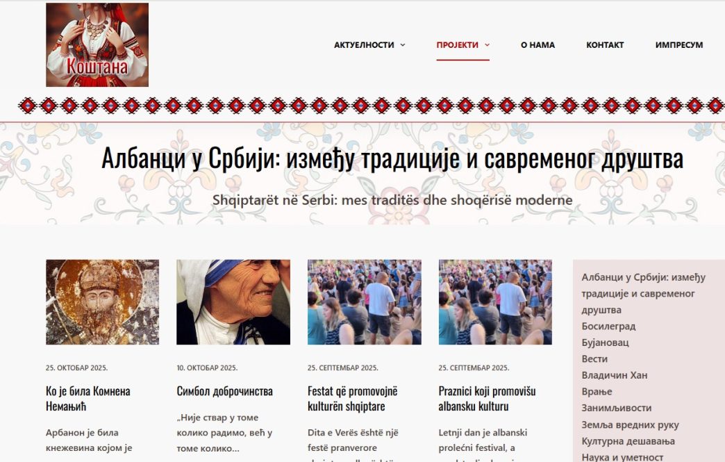 Bujanovac, 12. novembar 2025. – Portal “Koštana” iz Vranja objavljuje plagirane i falsifikovane medisjke sadržaaje u okviru projekta Ministarstva „Albanci u Srbiji: između tradicije i savremenog društva”. Ovaj anonimni portal jedini je medij u Srbiji koji je na konkursu dobio novac da bi informisao Albance na njihovom maternjem jeziku i za to dobio 500.000 dinara od 60 miliona namenjenih informisanju na jezicima nacionalnih manjina. Osnivač i vlasnik Koštane je SS Turistička televizija 1961 doo Beograd, a glodurka izvesna Milena Božić. Ukratko, ako nekome nije jasno, portal Koštana neskriveno zloupotrebljava javni novac!