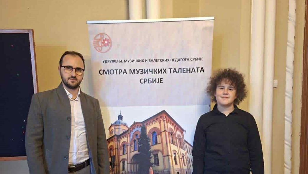 Bujanovac, 24. novembar 2025. (Foto: Profesor Stoimenov i Aleksa) – Bujanovčanin Aleksa Zlatković ponovo je pokazao kakav je talenat, pobedivši i na 23. Smotri muzičkih talenata Srbije. Učenik četvrtog razreda bujanovačke Muzičke škole osvojio je prvo mesto na takmičenju u Sremskim Karlovcima.