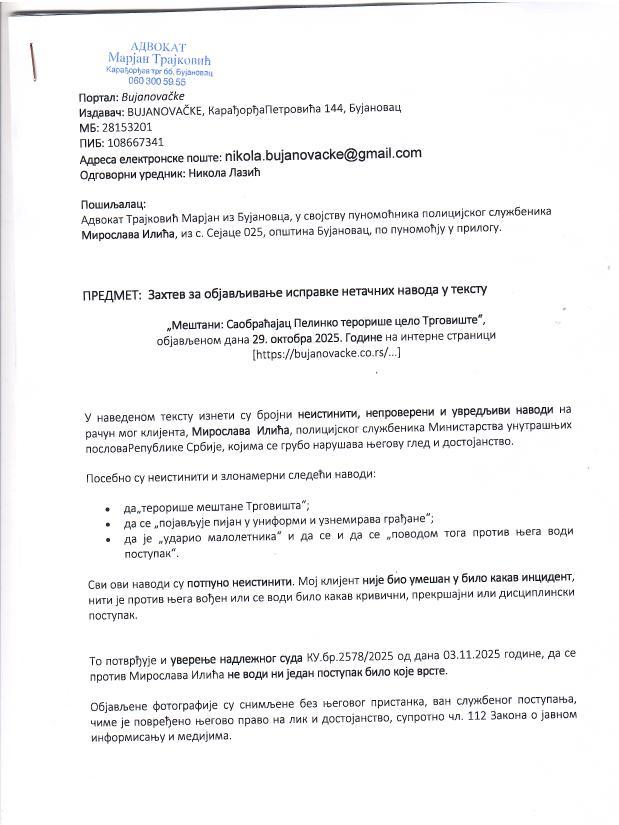 Bujanovac, 26. novembar 2025. – Pravni zastupnik saobraćajca Miroslava Ilića zatražio je od Bujanovačkih “objavljivanje ispravke netačnih navoda” u našem tekstu “Meštani: Saobraćajac Pelinko teroriše celo Trgovište”, objavljenog 29. oktobra 2025.