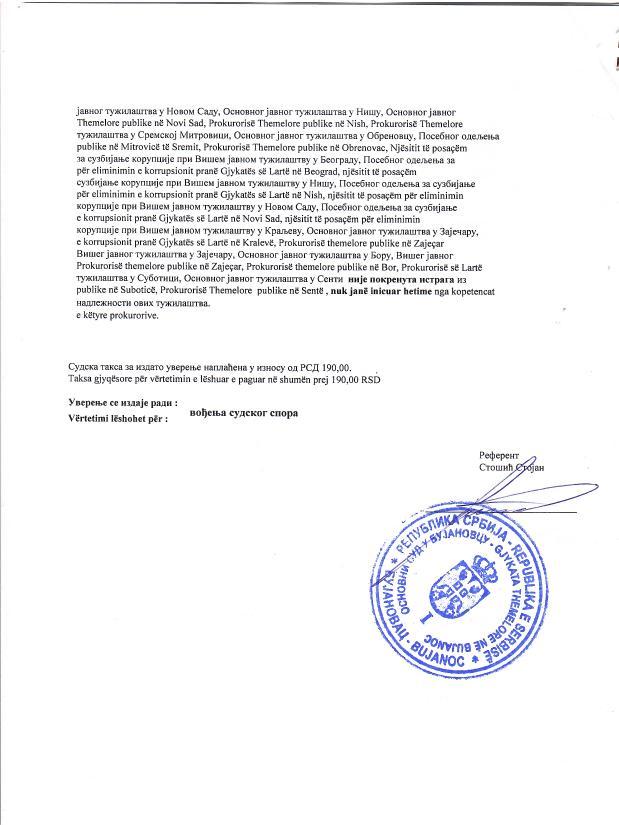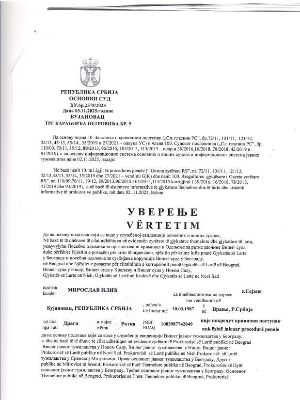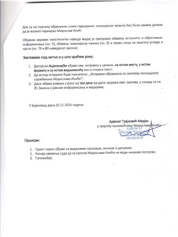 Poštujući novinarske postulate, Bujanovačke objavljuju skenirani zahtev advokata Trajkovića, kao i uverenje Osnovnog suda u Bujanovcu da se protiv njegovog klijenta “ne vodi ni jedan postupak bilo koje vrste”.