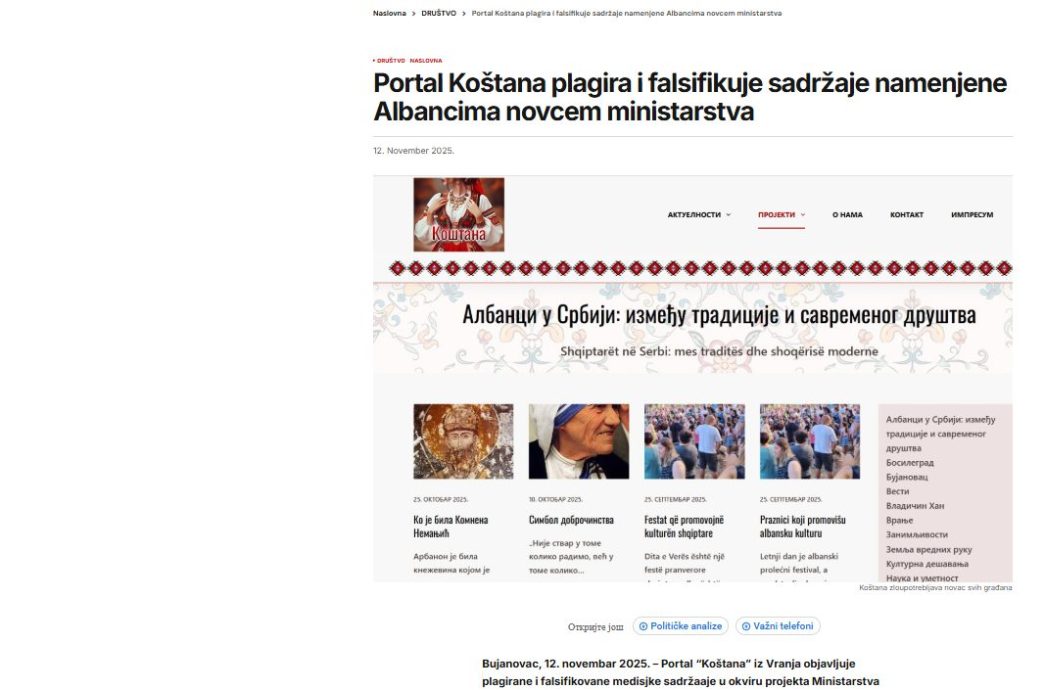 Bujanovac, 3. decembar 2025. – Portal Koštana reagovao je na naš tekst “Portal Koštana plagira i falsifikuje sadržaje namenjene Albancima novcem ministarstva”.