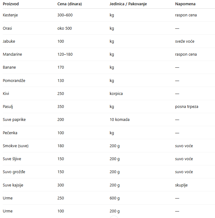 Smokve koštaju 180 dinara, suve šljive 150, suvo grožđe 150, dok su suve kajsije među skupljima i dostižu cenu od 300 dinara za 200 grama. Urme se prodaju po ceni od 250 dinara za pakovanje od 600 grama, odnosno 100 dinara za 200 grama.