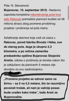 -Put za Rakovac, u dužini od preko 2,2 km, premašio je planirani iznos iz 2019. godine zbog zahteva da se kolovoz proširi sa 5 m na 5,5 m. Taj zahtev i insistiranje potiču od Stojanče Arsića (foto 2), koji je glavni koalicioni partner današnjeg predsednika opštine i aktuelni šef odborničke grupe SNS – naglasio je Salihi.