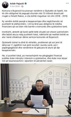 Bujanovac, 9. januar 2026. Pajaziti pokušava da prikrije nesposobnost vlasti koju predvodi optužujući opozicione stranke za skidanje 20 miliona dinara sa računa Opštine, kaže organizacioni sekretar opozicione Partije za demokratsko delovanje (PDD) i odbornik Rahim Salihi. On je reagovao nakon što je predsednik opštine Bujanovac Arber Pajaziti u petak objavio da je Opština ostala bez 20 miliona dinara presudom Apelacionog suda, zbog neisplaćenih obaveza nastalih tokom rekonstrukcije puta Bujanovac – Rakovac 2019. godine. Opštinu je tužila i spor dobila kompanija “Saba Belča”.