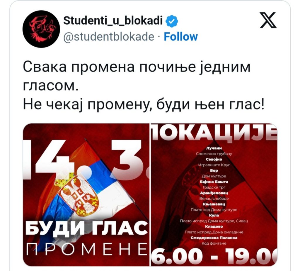 “Svaka promena počinje jednim glasom. Ne čekaj promenu, budi njen glas”, navodi se u objavi “Studenata u blokadi” na mreži X.