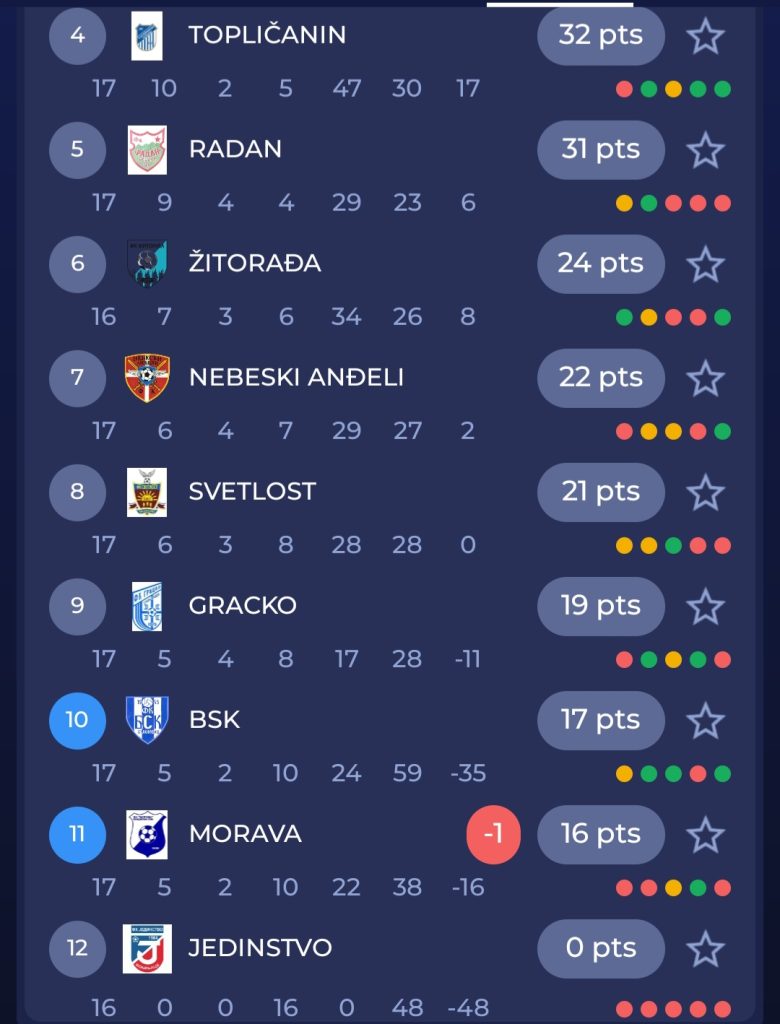 U ovom kolu je došlo i do promene na vrhu tabele – Jedinstvo (GS) je posle pobede nad 6:1 nad Grackom (6:1) preteklo Pčinju iz Trgovišta koja je izgubila od Topličanina (5:1). Jedinstvo ima 37, a tim iz Trgovišta bod manje.