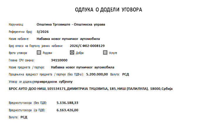 -Dok se opština suočava sa brojnim infrastrukturnim i socijalnim problemima, Opštinska uprava Trgovište donela je Odluku o dodeli ugovora (broj 40-143/2026) za nabavku novog putničkog automobila. Prema zvaničnoj dokumentaciji, vrednost ovog ugovora sa uračunatim PDV-om iznosi neverovatnih 6.163.426,00 dinara, odnosno više od 52.000 evra – navodi Krstić.