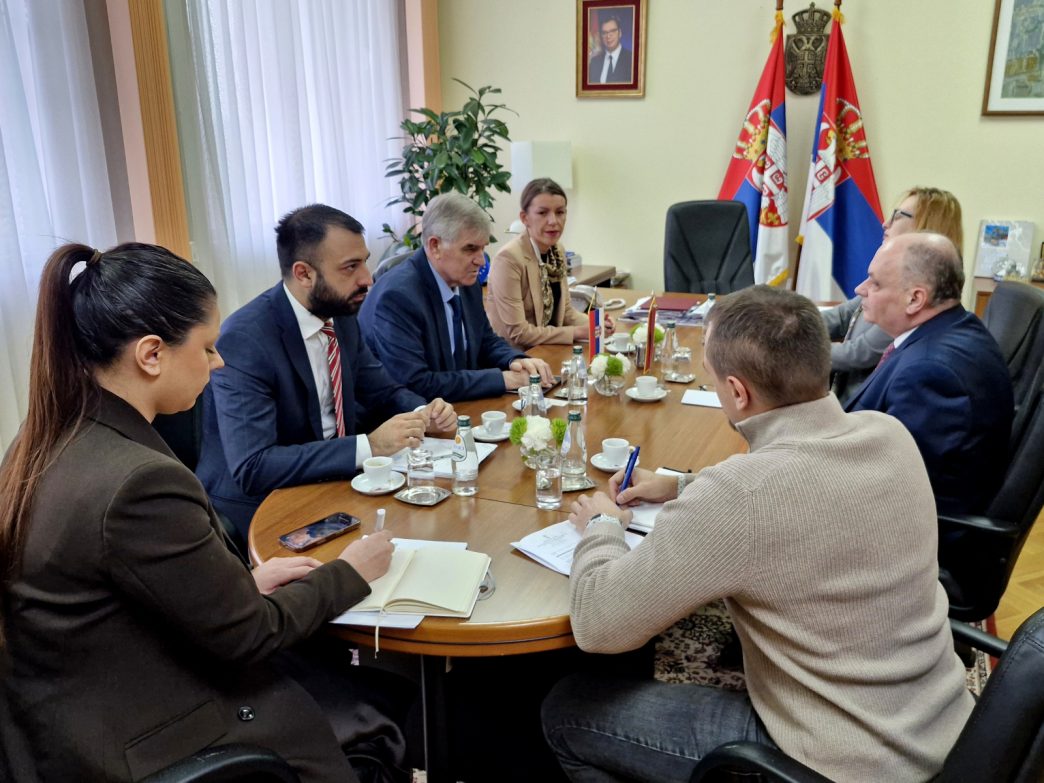 Bujanovac, 2. april 2026. (foto ministarstvo) – Ministar za ljudska i manjinska prava i društveni dijalog Demo Beriša sastao se sa ambasadorom Albanije u Srbiji Bardilom Canajem sa kojim je konstatovao da je, uprkos izazovima koji postoje u odnosima dve države, potrebno otvoriti nova poglavlja u cilju intenziviranja bilateralnih odnosa i unapređenja položaja albanske zajednice u Srbiji.